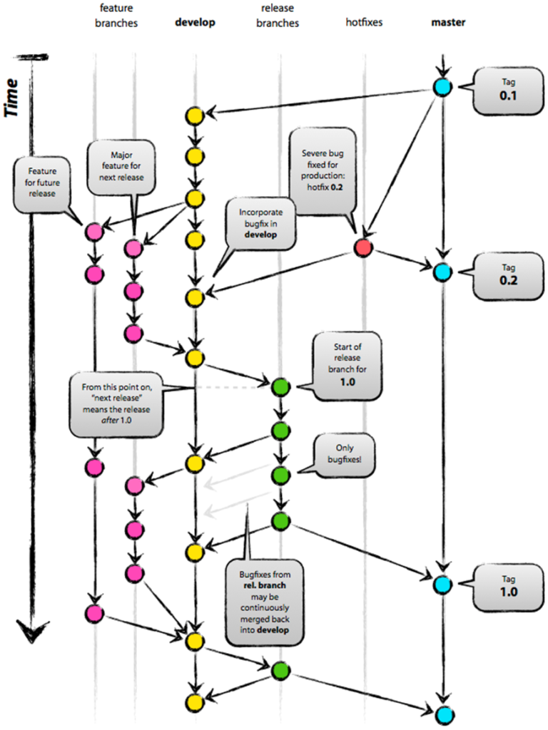 Esquema ilustrativo del flow en GIT y conceptos de funcionamiento del mismo.