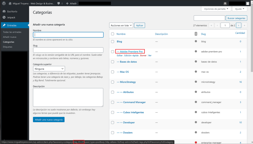 27 de agosto de 2023Antes de ver el código, es necesario averiguar el identificador de la categoría que vas a ocultar. Para ello accede a Entradas > Categorías. Sitúate encima de una categoría y en la parte inferior del navegador aparecerá la URL. El identificador de tu categoría viene después del código ‘tag_ID=’ si no lo ves puedes pulsar en el enlace Ver de la categoría y verlo directamente en la URL del navegador.